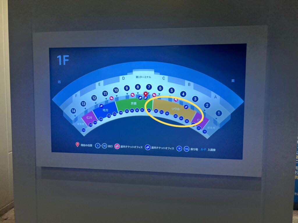 有人チケットカウンターで購入する場合は、事前に何番に乗りたいかをNAVERマップで調べておくのが簡単◎